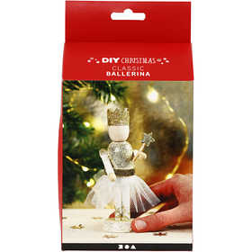 Set di materiale per 1 principessa, consiste in figura e legno festivo, tulle, nastro gitter, vernice, pennello, nastro biadesivo e glitter Contiene: 1 figura e bastoncino di legno, 20ml di vernice bianca, pennello, 5g di glitter oro, 1x10cm di nast.