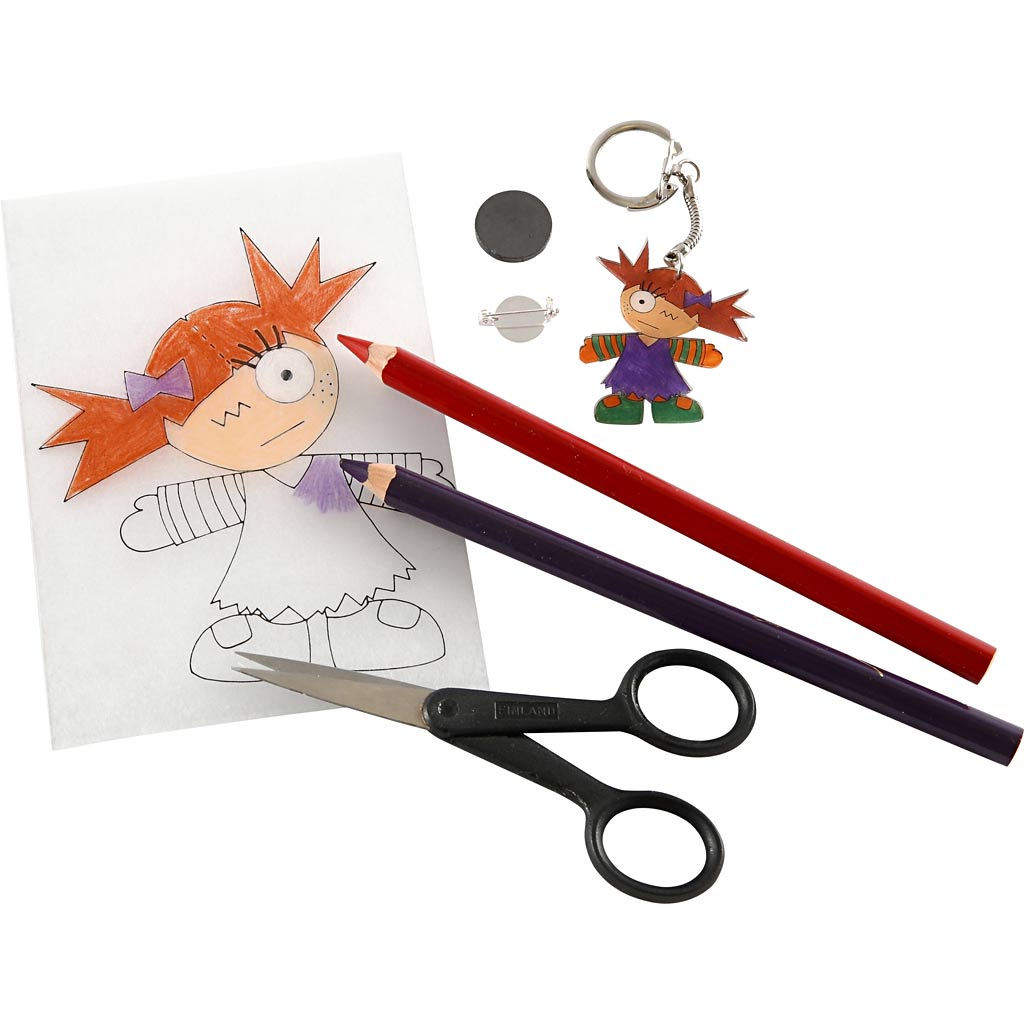Fogli con motivi prestampati sia con superficie opaca che lucida.Scaldata nel forno di casa la plastica si riduce del 40% circa. Si può decorare con pastelli colorati sul lato opaco, e su quello lucido per esempio con Uniposca, Skrib o Plus Color Mar