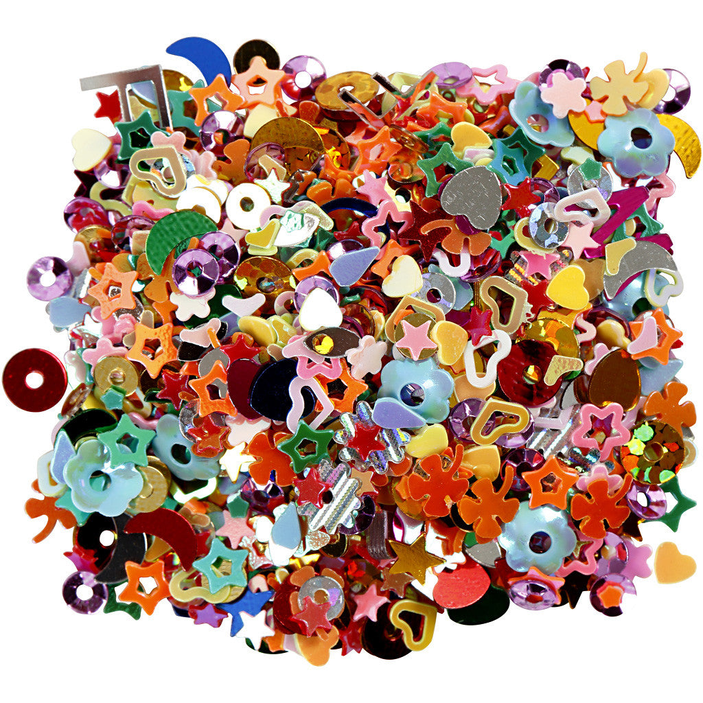 Mix di lustrini piccoli di varie forme e colori brillanti. In contenitore con tappo a saliera
