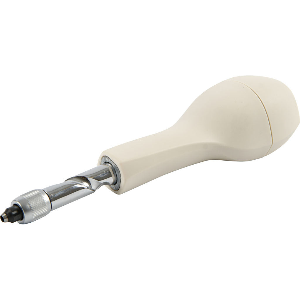 Perforatore a vite per praticare fori di tre misure su molti strati di carta, cartoncino pesante, stoffa, impiallacciatura, sughero, pelle, lamina di metallo. Le punte di ricambio sono conservate nel manico