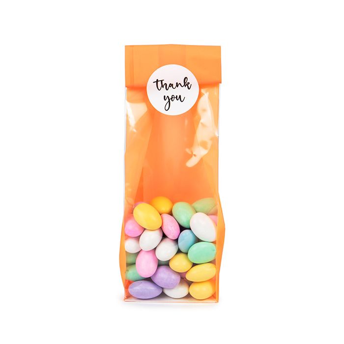 Progettati per contenere articoli da regalo, dolciumi, vendita al dettaglio e mercati, i sacchetti con fondo a blocco arancione neon con inserto in carta si fanno notare. Caratterizzato da un retro arancione neon e da un fronte trasparente, il sacchetto FGPB17NO misura 7 x 5,1 x 25,4 cm ed è adatto per articoli come prodotti da forno, caramelle sfuse, cosmetici, incenso, artigianato e altro ancora. Ogni sacchetto è dotato di un inserto di carta bianca che permette al sacchetto di stare in piedi da solo e fornisce una maggiore stabilità. Per comodità, questi sacchetti vengono forniti aperti, ma possono essere sigillati con una termosaldatrice, fiocchetti pre-stesi, lint o possono essere ripiegati e fissati con un adesivo o un'etichetta personalizzata.
