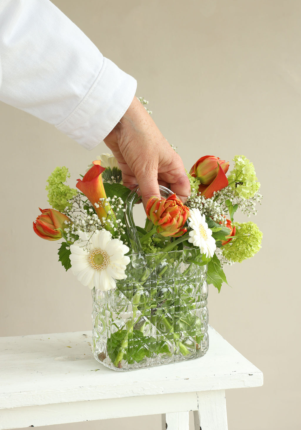 Il vaso da fiori rimane stabile ed è super carino da mettere su una mensola o su un tavolo. Riempi facilmente la borsa con tutti i tipi di fiori, o se vuoi goderti il tuo pezzo decorativo più a lungo, ti consigliamo di riempire il set con fiori secchi!